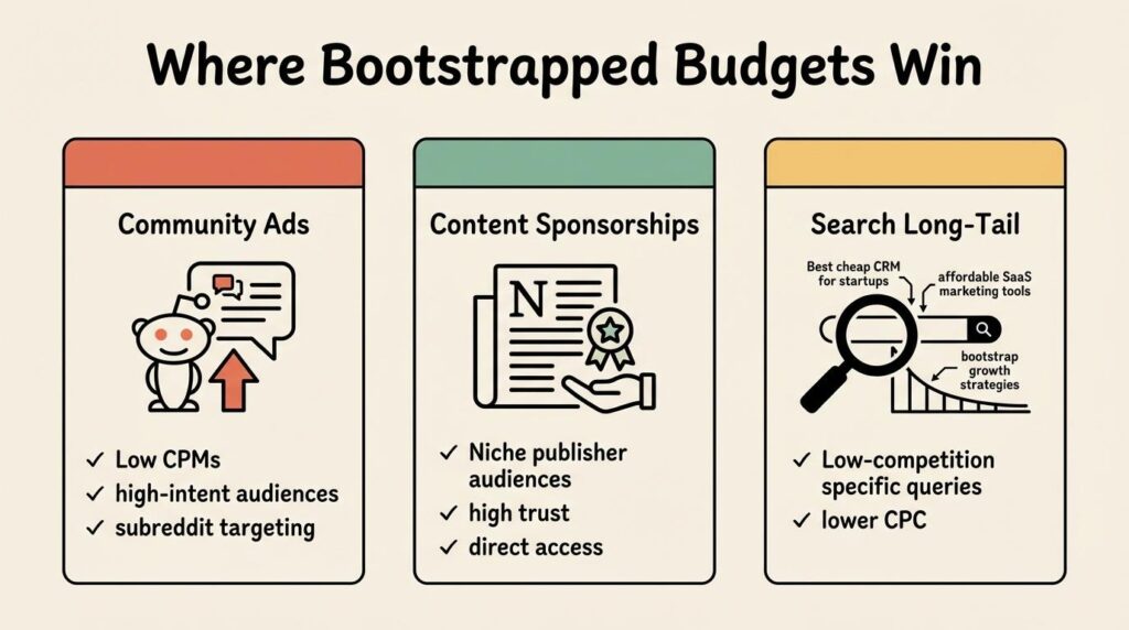 The best channels for bootstrapped teams let you test with $500-$2,000 per month and still generate enough data to make decisions. If a platform requires $10,000 per month before its targeting kicks in, it is built for funded companies.