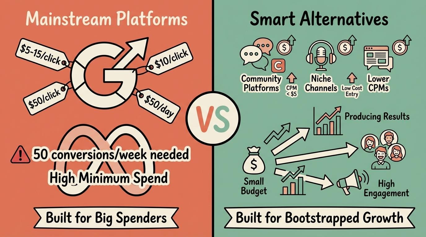 The best channels for bootstrapped teams let you test with $500-$2,000 per month and still generate enough data to make decisions. If a platform requires $10,000 per month before its targeting kicks in, it is built for funded companies.